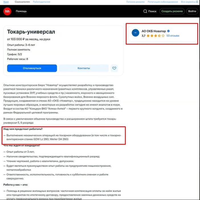 К кандидату предъявляется требование уметь работать на токарно-винторезных станках GDW Lz 280 и Weiler DA 260. Среди других критериев — опыт работы более трёх лет и умение читать чертежи.