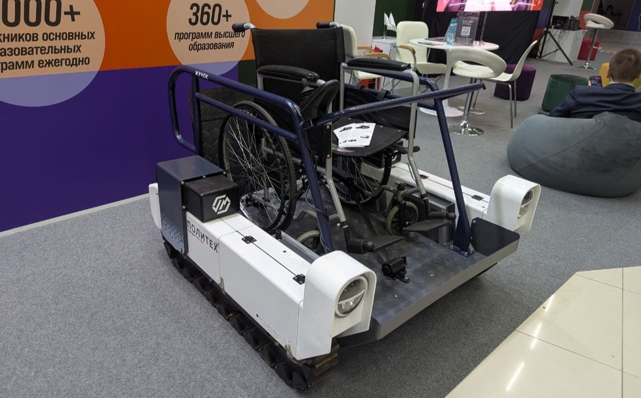 Специалисты Санкт-Петербургского политического университета Петра Великого (СПбПУ) разработали универсальную гусеничную платформу для транспортировки инвалидной коляски с пассажиром. Изделие представили на выставке V Конгресса молодых учёных в «Сириусе», на которой побывал корреспондент «Первого технического».