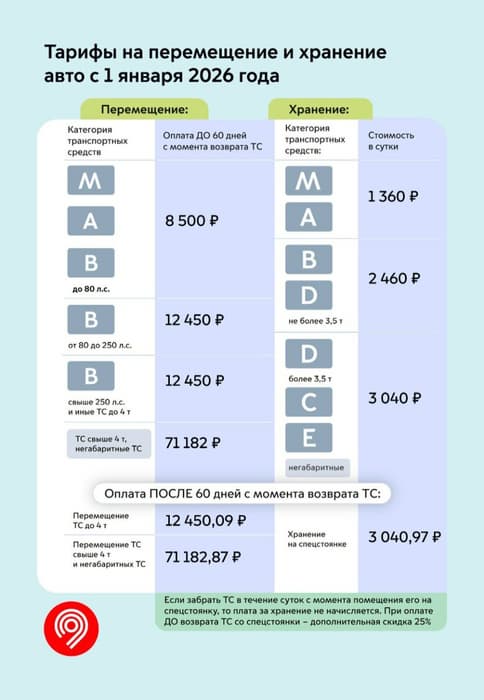 Что касается хранения транспортных средств, то сейчас стоимость варьируется от 1210 до 2893 рублей за сутки. Начиная с 1 января 2026 года, она составит от 1360 до 3040 рублей. Однако сохранятся как первые бесплатные сутки хранения, так и скидка за быструю оплату.