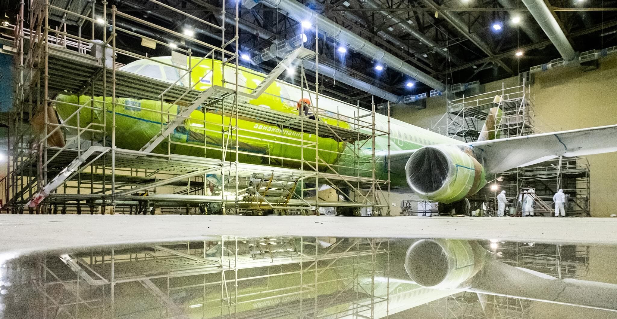 Для покраски самолётов существует отдельный ангар, где старая краска полностью снимается, а новая наносится вручную слоями — на один лайнер уходит до 300 кг краски, что улучшает аэродинамику и экономичность самолёта.
