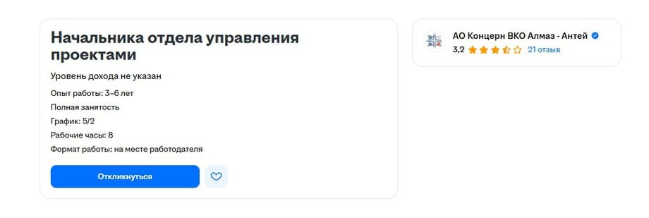 Концерн ВКО «Алмаз-Антей» объявил о поиске квалифицированного специалиста на позицию начальника отдела управления проектами. Соответствующая вакансия появилась на одном из российских рекрутинговых сайтов.
