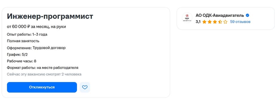 Пермское предприятие «ОДК-Авиадвигатель» ищет специалиста с опытом работы 1–3 года на позицию инженера-программиста. Вакансию опубликовали на одном из рекрутинговых сайтов.