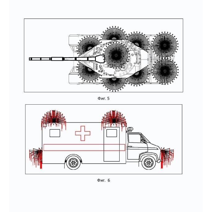 На иллюстрациях к патенту устройство показано установленным на танке, где оно прикрывает уязвимые зоны от атак ударных БПЛА и сбрасываемых боеприпасов.