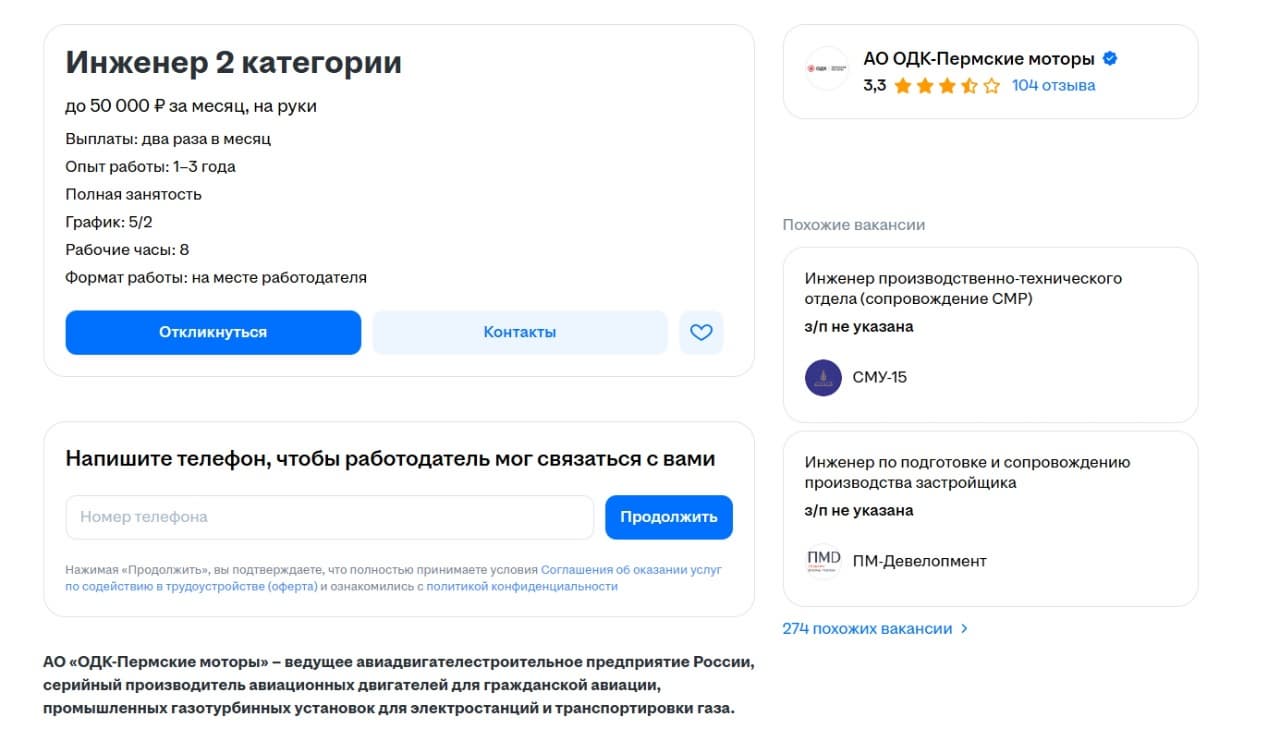 Предприятие «ОДК — Пермские моторы» объявило о поиске инженера второй категории с опытом работы от 1–3 лет. Вакансию опубликовали на одном из рекрутинговых сайтов.