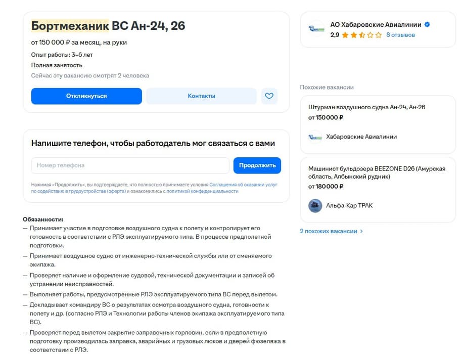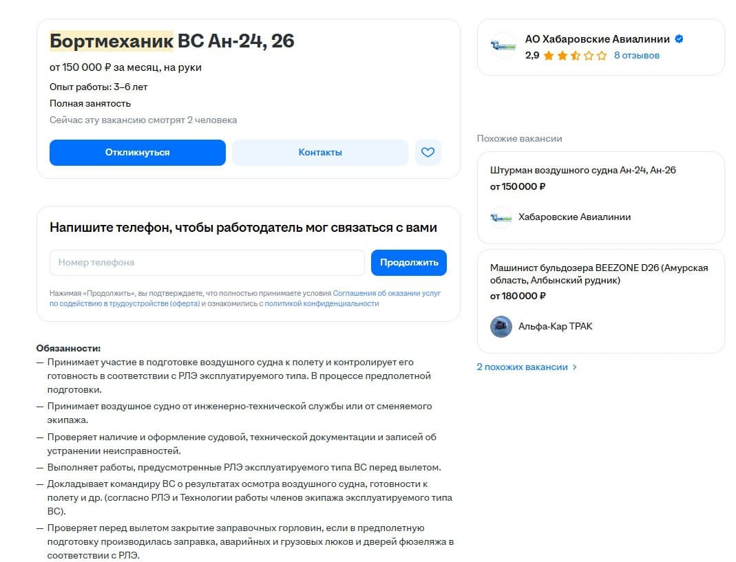 В открытом доступе «Первый технический» нашёл вакансию бортмеханика для Ан-24 и Ан-26. Авиакомпания «Хабаровские авиалинии» готова платить такому специалисту от 150 тысяч рублей на руки, однако опыт работы нужен не менее трёх лет.