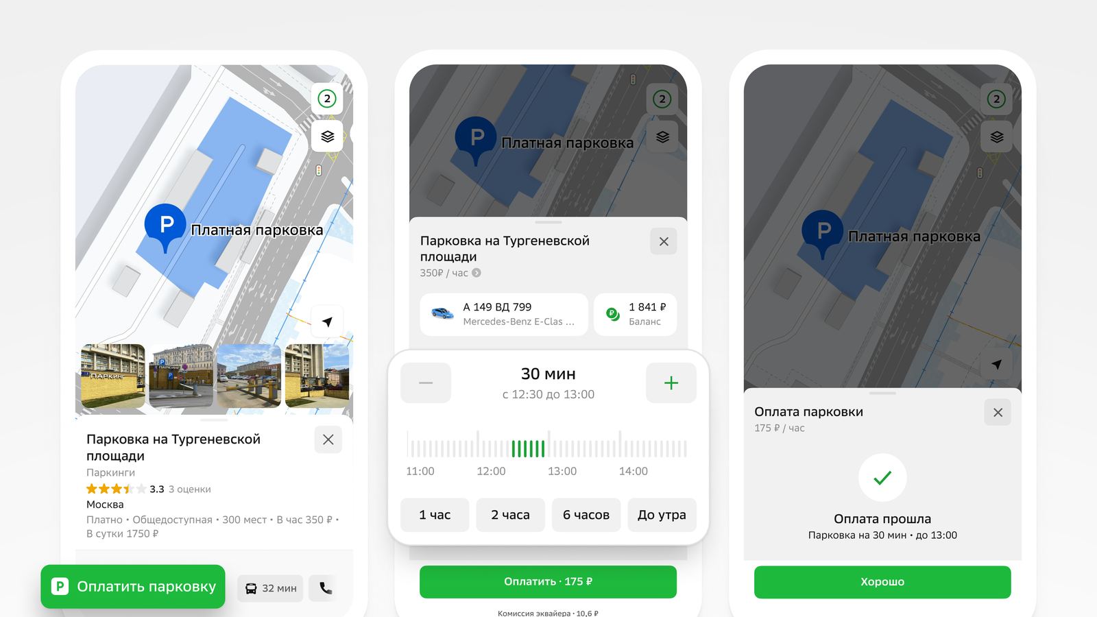 Пользователь также может воспользоваться картой и выбрать стоянку. В её карточке отобразится информация для проведения платежа.