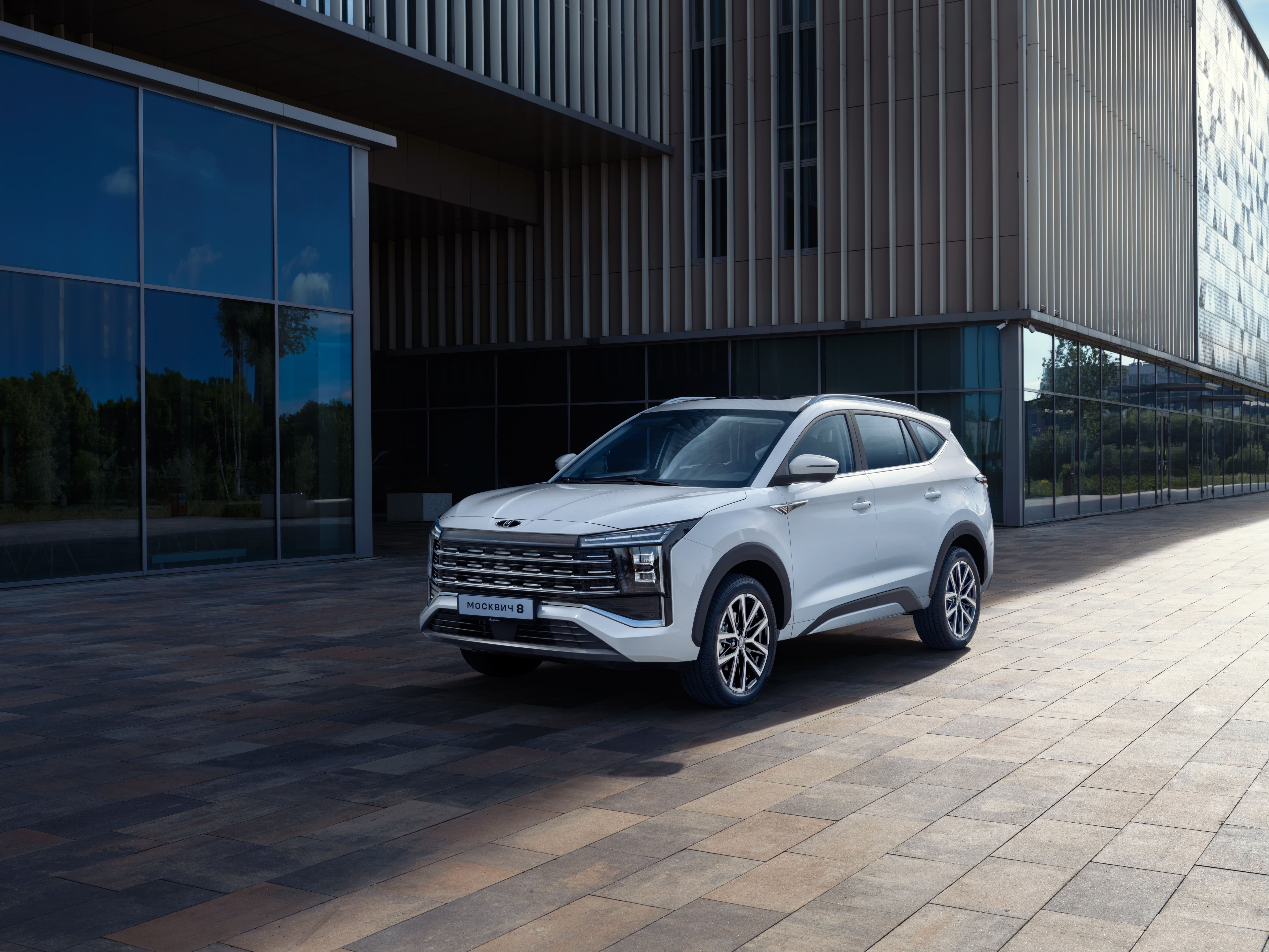 Кроссовер «Москвич 8» был представлен летом 2023 года и является самым крупным автомобилем бренда. Он создан на базе китайского JAC X8 Plus и оснащён 1,5-литровым турбомотором мощностью 174 л. с. и 7-ступенчатой роботизированной коробкой передач. При длине 4825 мм и колёсной базе 2830 мм автомобиль сравним по габаритам с Hyundai Santa Fe и Chery Tiggo 8 Pro Max.