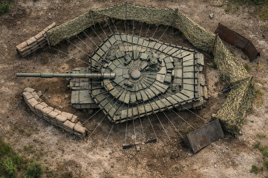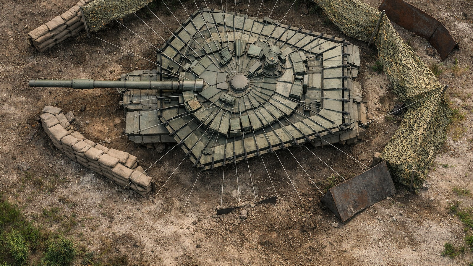 При контакте с полотнищами дрон теряет устойчивость, повреждается или подрывается на безопасном расстоянии от брони. Это снижает эффективность кумулятивного боеприпаса и уменьшает риск поражения башни.