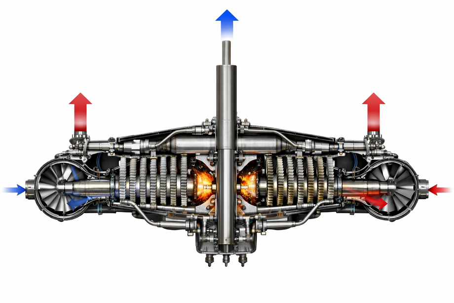 Согласно расчётам инженеров, такая схема позволяет повысить эффективность установки, снизить нагрузку на опорные узлы и улучшить распределение потоков. Дополнительно в конструкции применены газодинамический подшипник с воздушной подушкой и автономная система охлаждения редуктора.