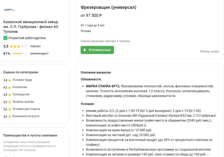 Казанский авиазавод (КАЗ, входит в ПАО «Туполев») открыл вакансию на позицию фрезеровщика. Информация об этом появилась на одном из сервисов поиска работы.