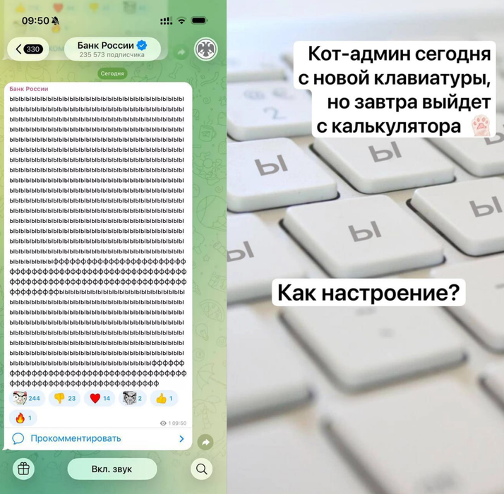 Позже в канале появилась история с объяснением: «Кот-админ сегодня с новой клавиатуры», а затем и фото клавиатуры, где все клавиши заменены на букву «ы». Завтра кот «выйдет с калькулятора», пообещали в ЦБ.