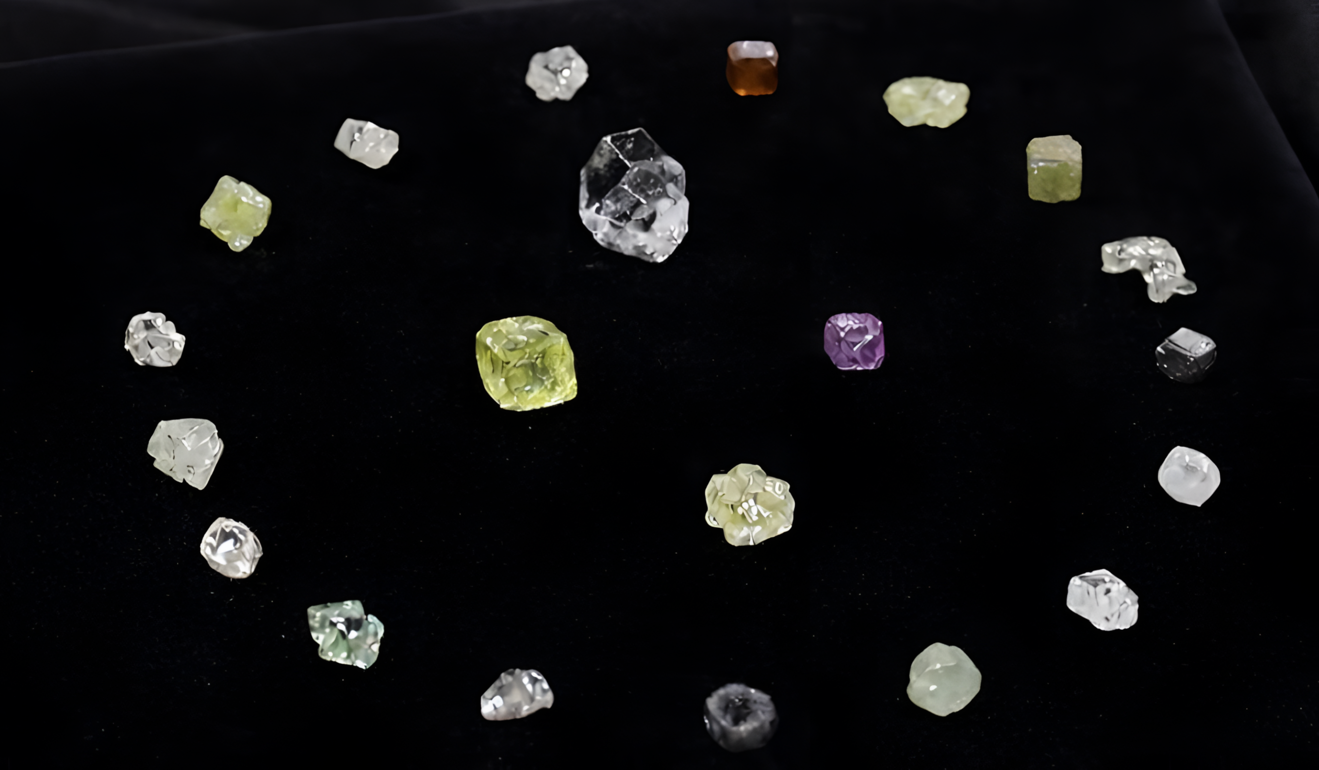 Коллекция пополнилась 238 алмазами фантазийных цветов — среди них фиолетовые, зелёно-жёлтые, жёлтые, оранжево-коричневые и другие уникальные экземпляры. Ещё 18 кристаллов получили собственные имена благодаря необычной форме и природным особенностям: «Символ АЛРОСА», «Игла», «Мушка», «Цветочек», «Перо Павлина», «Юла», «Сердечко» и другие.