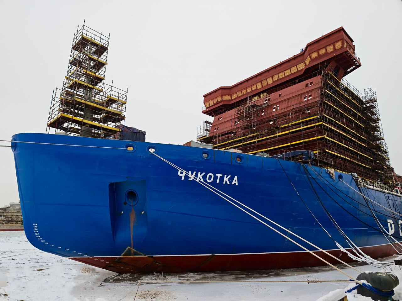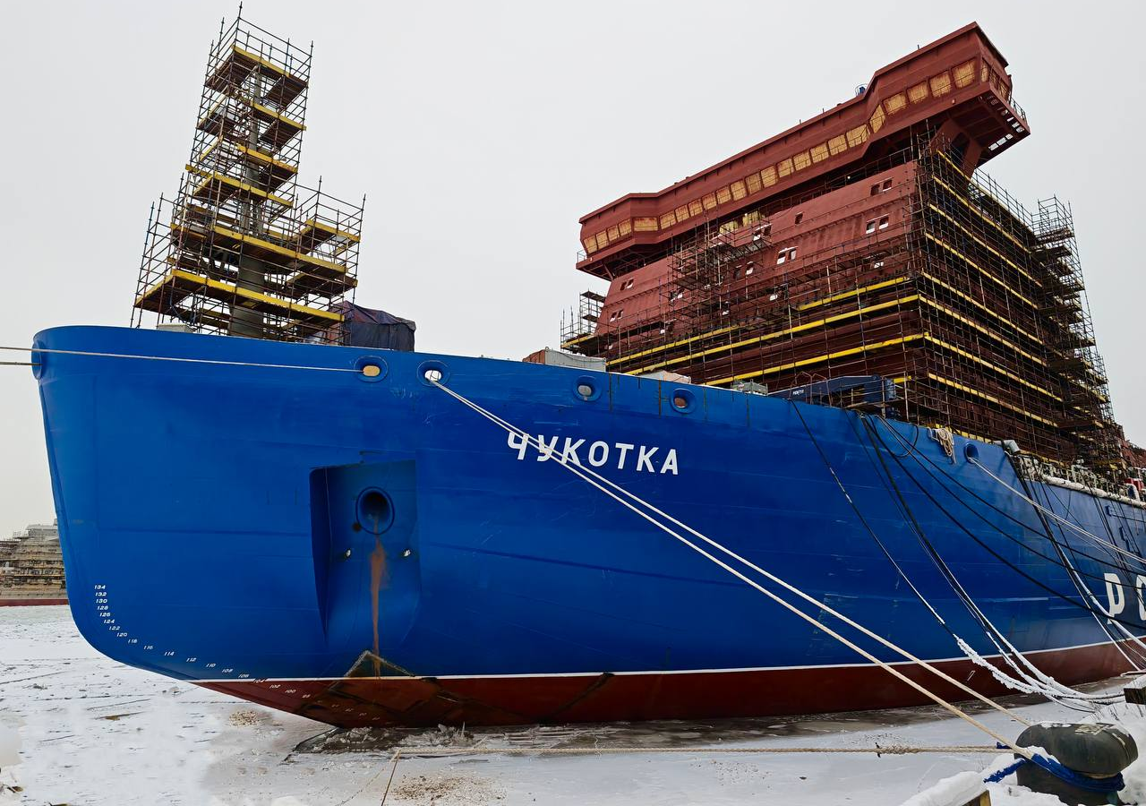 «Чукотка» — пятый универсальный атомный ледокол серии проекта 22220, строящийся на Балтийском заводе. Судно заложили в декабре 2020 года, спуск на воду состоялся в ноябре 2024-го. Ледоколы этого проекта способны преодолевать сплошные льды толщиной до трёх метров и обеспечивают круглогодичную навигацию в западном секторе Арктики, включая ключевые трассы Северного морского пути.