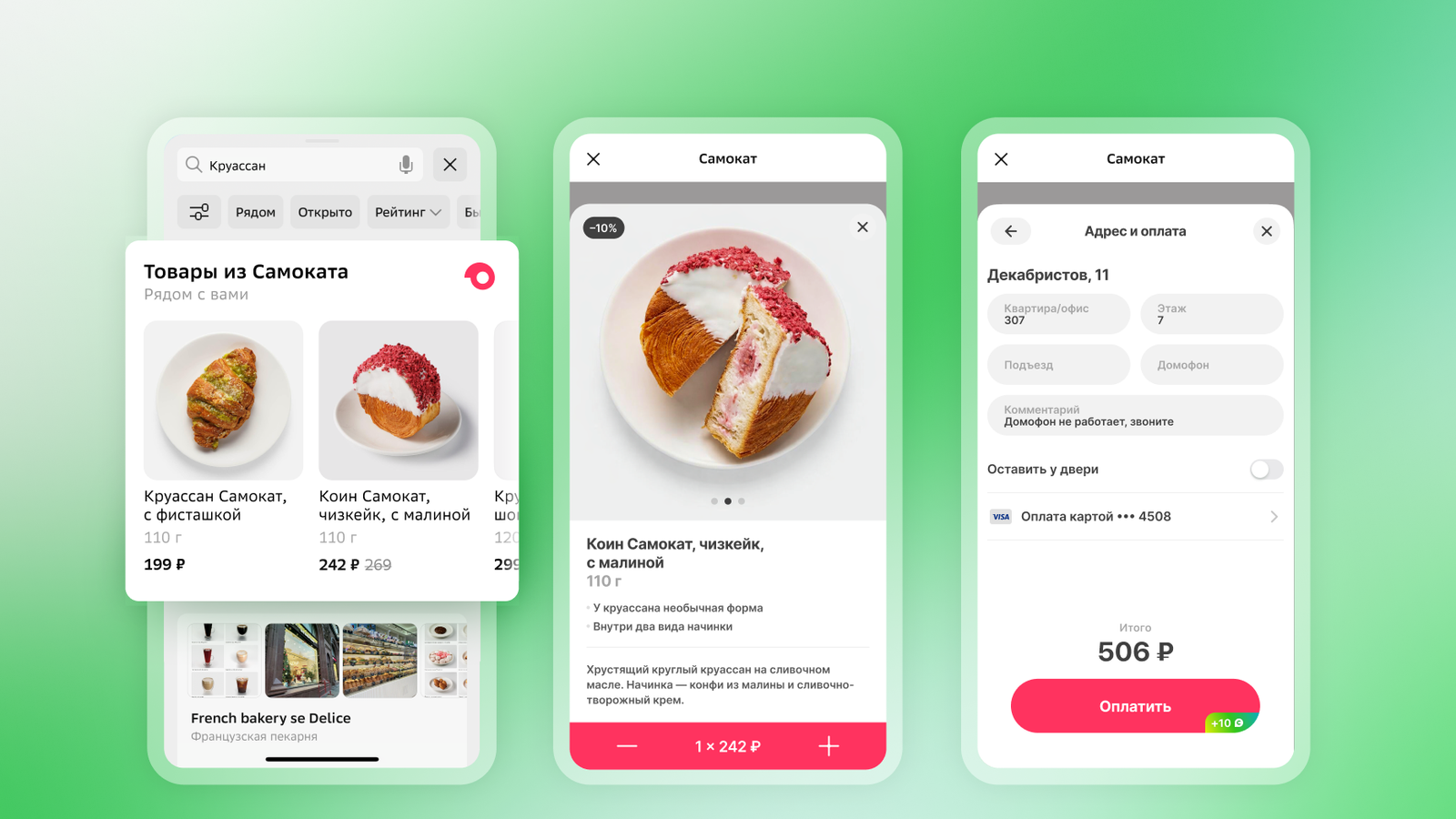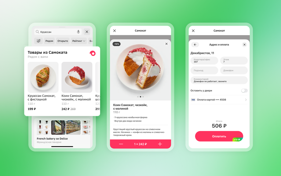 При поиске продуктов, готовых блюд, товаров для дома или косметики пользователи видят блок с предложениями «Самоката». При нажатии на товар внутри «2ГИС» открывается веб-приложение сервиса — там можно авторизоваться, собрать корзину и оформить доставку. После завершения заказа приложение возвращает пользователя в интерфейс «2ГИС» без потери контекста.