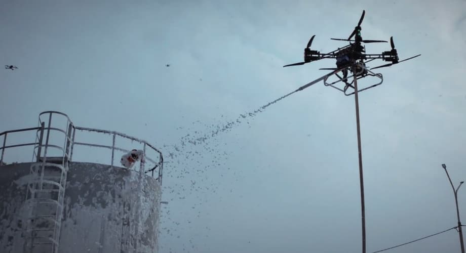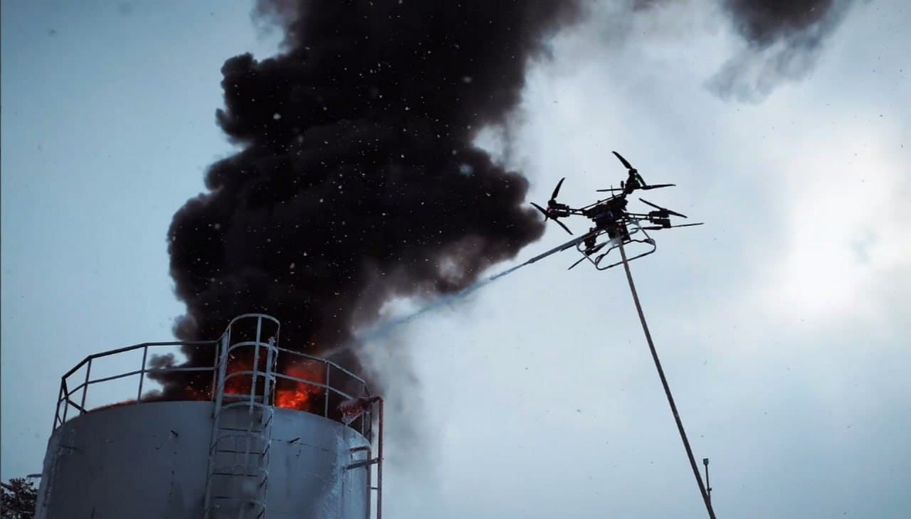 Дрон поднялся на высоту 12 метров, провёл тепловизионную разведку и подал огнетушащее вещество в очаг горения резервуара с горючей жидкостью — одного из наиболее сложных типов пожаров на промышленных объектах.