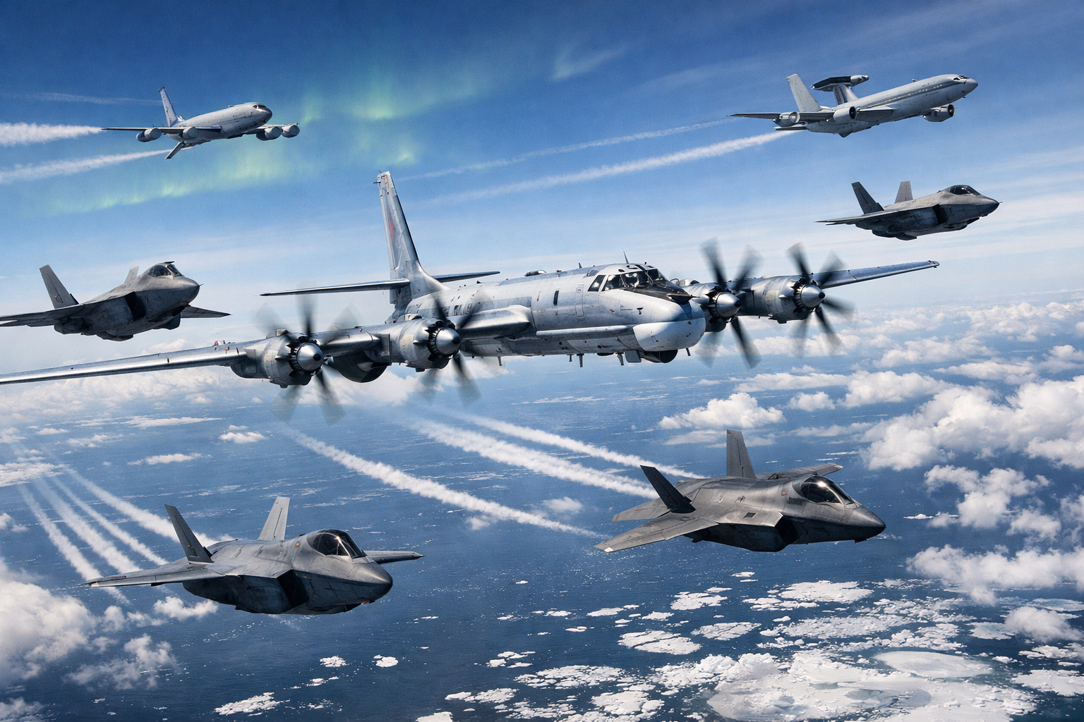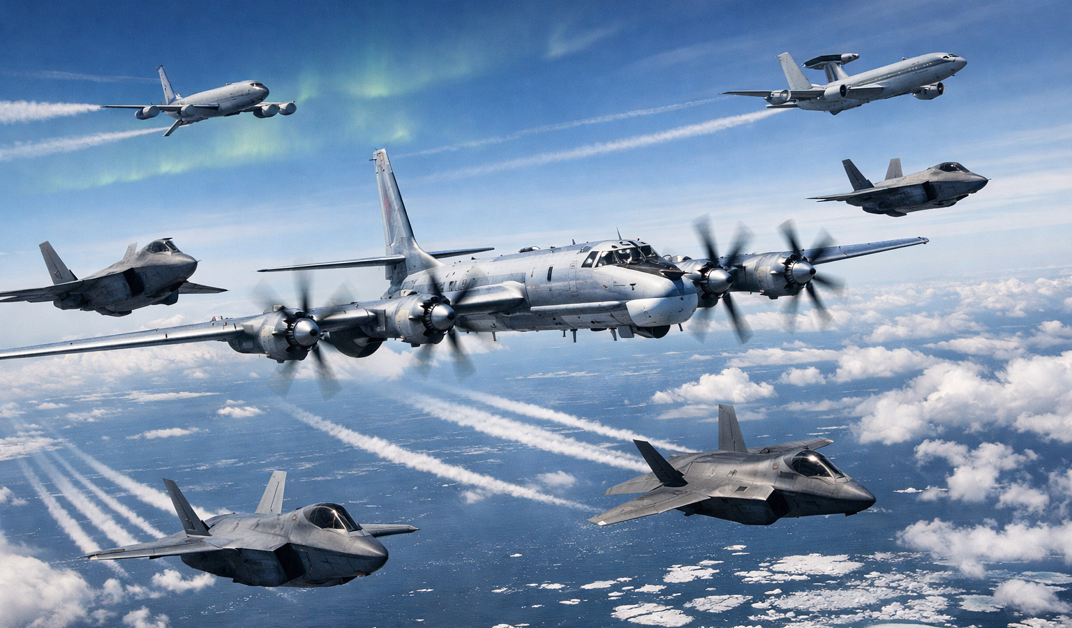 В составе группы перехвата — два истребителя F-22 Raptor, два F-35A Lightning II, четыре танкера-заправщика KC-135 Stratotanker, самолёт дальнего радиолокационного обнаружения E-3 Sentry, два канадских CF-18 Hornet и один канадский заправщик CC-150 Polaris. Российские самолёты не нарушали суверенного воздушного пространства США и Канады и оставались в нейтральной полосе — опознавательной зоне ПВО, которая начинается за 12 морскими милями от береговой линии и простирается на 300 миль. По заявлению NORAD, подобные полёты России в этом районе происходят регулярно и не расцениваются как угроза.