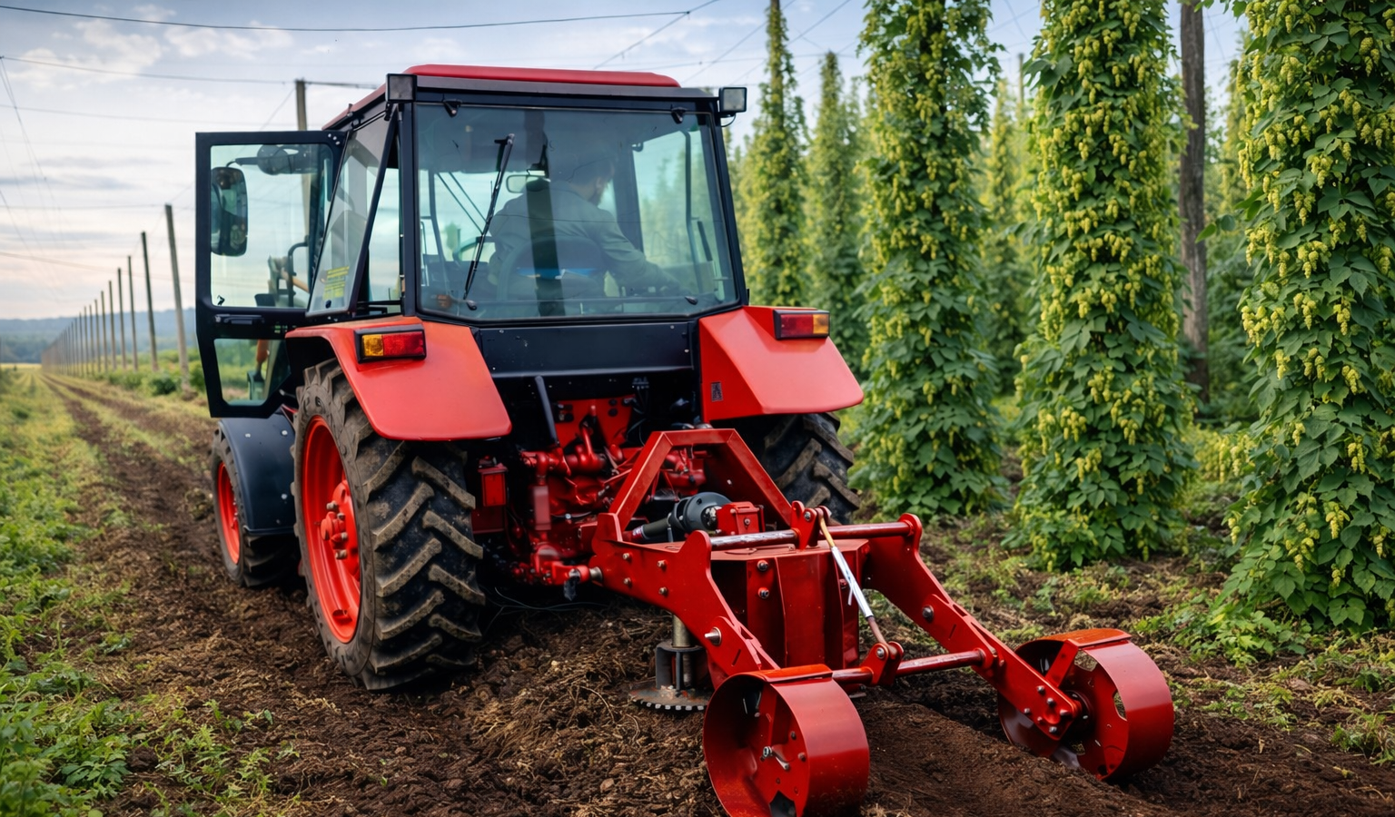 Речь идёт о сельскохозяйственном агрегате, который устанавливается на трактор и используется при обработке хмелевых плантаций. Устройство аккуратно рыхлит почву вокруг растений, формирует защитный слой земли и одновременно удаляет сорняки. Благодаря такой обработке корневая система хмеля получает больше воздуха и влаги, а сами растения начинают развиваться быстрее и устойчивее.