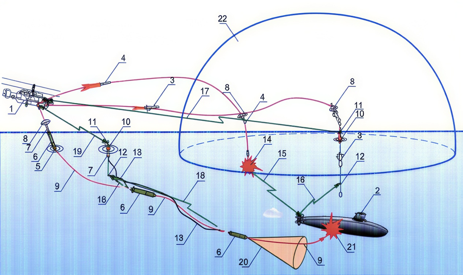 В район цели авиация заранее сбрасывает поисковые средства — радиогидроакустические буи и реактивные источники звука повышенной дальности. Они уточняют координаты субмарины и передают данные экипажу. Далее вертолёт строит курс так, чтобы пеленг на цель постоянно менялся. Машина проходит мимо, не двигаясь прямо на лодку.