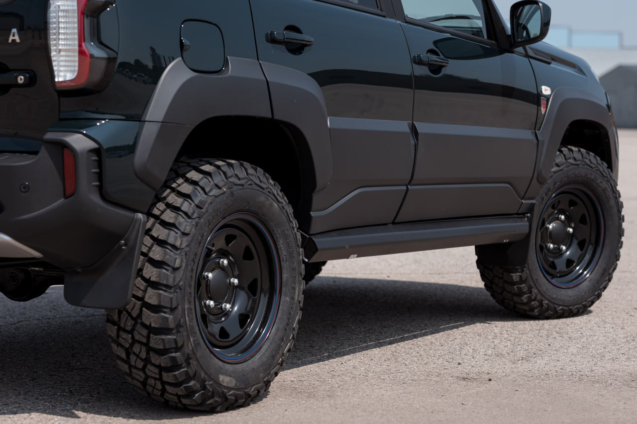 Подвеску тоже подняли и усилили. Лифт-комплект изменил её геометрию и укрепил нагруженные элементы, а на автомобиль поставили литые диски с 29-дюймовыми колёсами. Дизайн дисков и резину выбирает сам владелец, поэтому каждая машина получается индивидуальной.