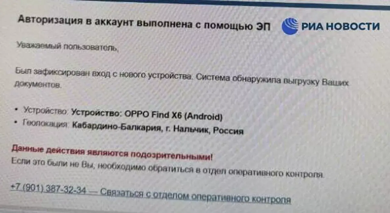 В таких письмах говорится: «Уважаемый пользователь, был зафиксирован вход с нового устройства. Система обнаружила выгрузку ваших документов».