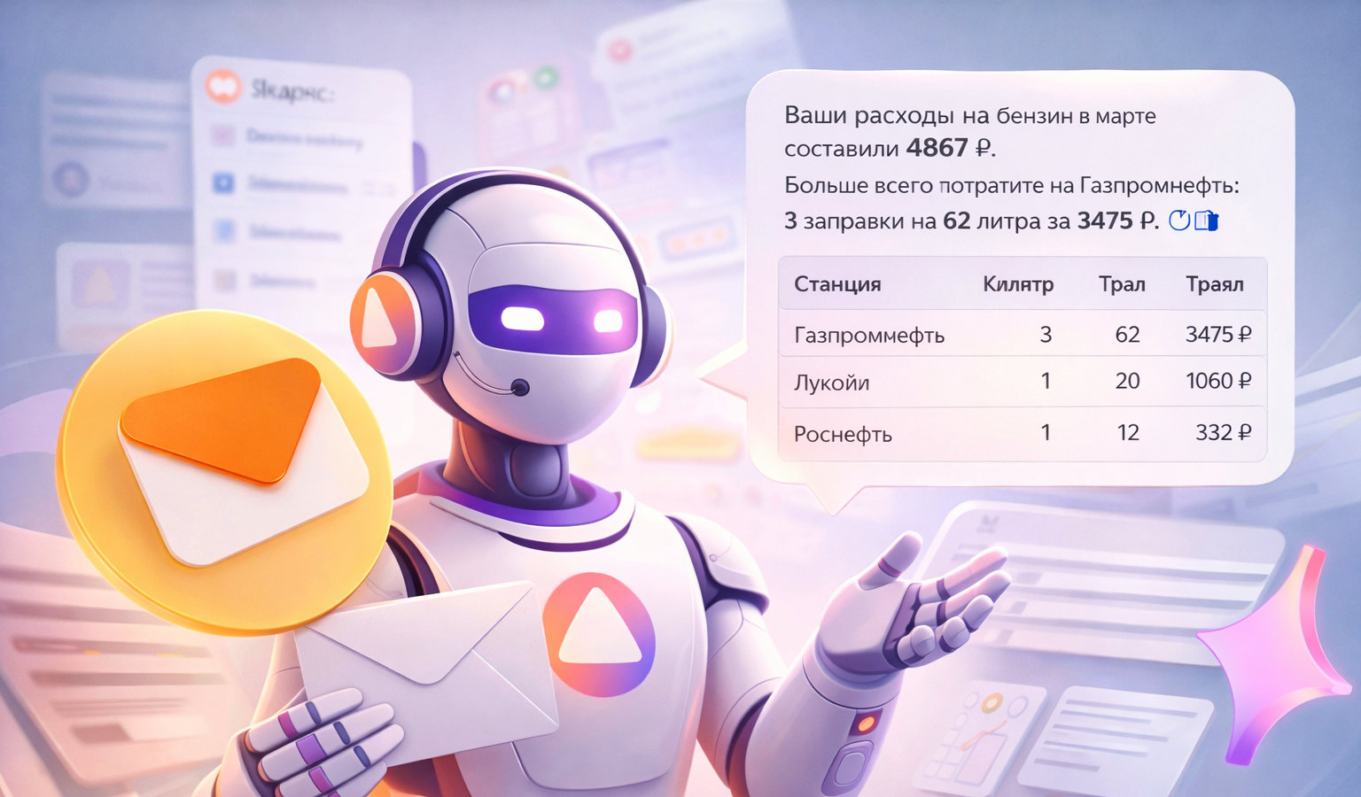 Ассистент умеет извлекать данные из писем и обобщать их. Например, может посчитать расходы по чекам, напомнить детали встречи по расшифровкам звонков или найти нужные данные в переписке. Вместо поиска по письмам пользователь получает сразу готовый ответ.