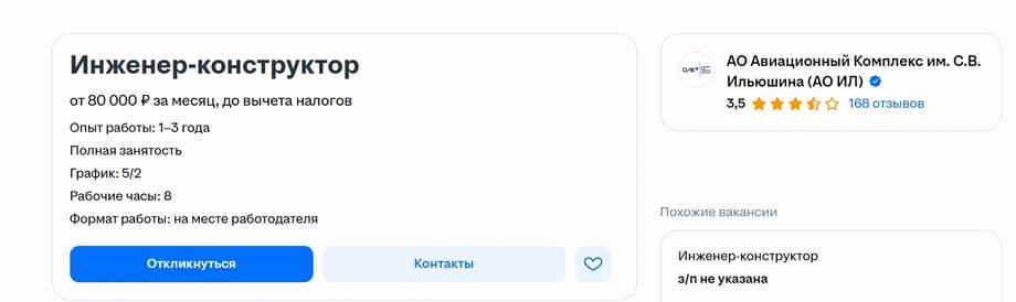 Такому специалисту ПАО «Ил» готово платить от 80 тысяч рублей (до вычета налогов). Среди обязанностей — работа с конструкторской документацией, разработка электронных моделей и чертежей и сопровождение производства.