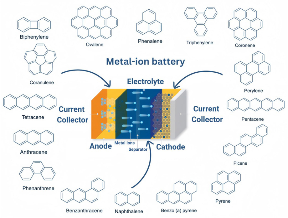 Полиароматические углеводороды (ПАУ) интересны из-за их особых свойств. Эти свойства позволяют им легко передавать электроны и впускать ионы внутрь своей структуры. Поведение ПАУ в химических реакциях зависит от их энергетических уровней. Если уровень энергии нижней незанятой орбитали (LUMO) низкий, ПАУ легко восстанавливаются, что полезно для анодных применений. Если же уровень энергии верхней занятой орбитали (HOMO) низкий, ПАУ легко окисляются, что полезно для катодов.
