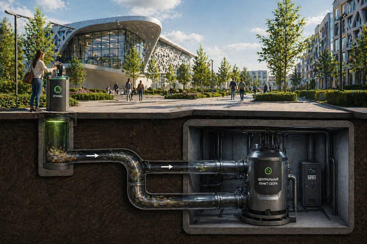 Сеть прокладывается на этапе комплексного благоустройства при реконструкции 17 гостиничных корпусов. Фактически инженерное решение превращает сбор отходов из коммунальной операции в незаметный фоновый процесс: система зашита в подземную инфраструктуру, не занимает полезную площадь и не создаёт шумовой нагрузки.